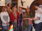 Druhá část oslavy probíhala v útulném klubu v pražské čtvrti Ořechovka, který byl zamluven pouze pro nás od 18:00. Při příchodu každý obdržek kalendářík FK Alej a slavností čepičku :-) Protože většina přítomných neobědvala, atmosféra by se dala krájet před tím, než trpělivá obsluha přinesla výborné řízečky, skvělý gulášek a dobře ochucená křidýlka. Po všech prvních várkách těchto pokrmů se jen zaprášilo. Pak s plnými žaludky jsme se mohli již věnovat slavnostmímu programu, jehož moderování se ujmul namísto nepřítomného Salavy moderátor mnohem vtipnější, pan Tomáš Kubík :-).
